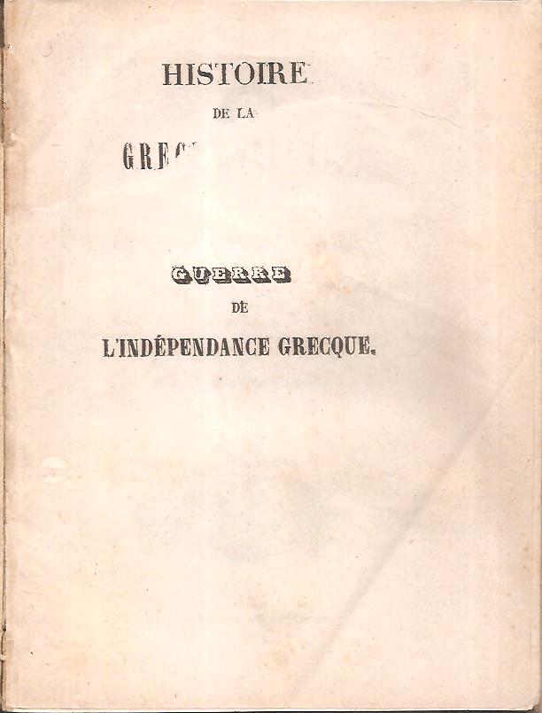 TCHOCAN TH. C., Histoire de la Grèce moderne. Guerre de l’indépendance. Traduction du Grec de l’histoire de M. C. Paparrigopoulos. Athènes, DE L’ IMPRIMERIE DE L’ ESPERNCE, 1858, 8ο, σελ. φ.2+88+2λ (χωρίς εξώφυλλο, λείπει κομμάτι 15Χ5 εκ. στο επάνω μέρος του 1ου φύλλου[ψευδότιτλος])