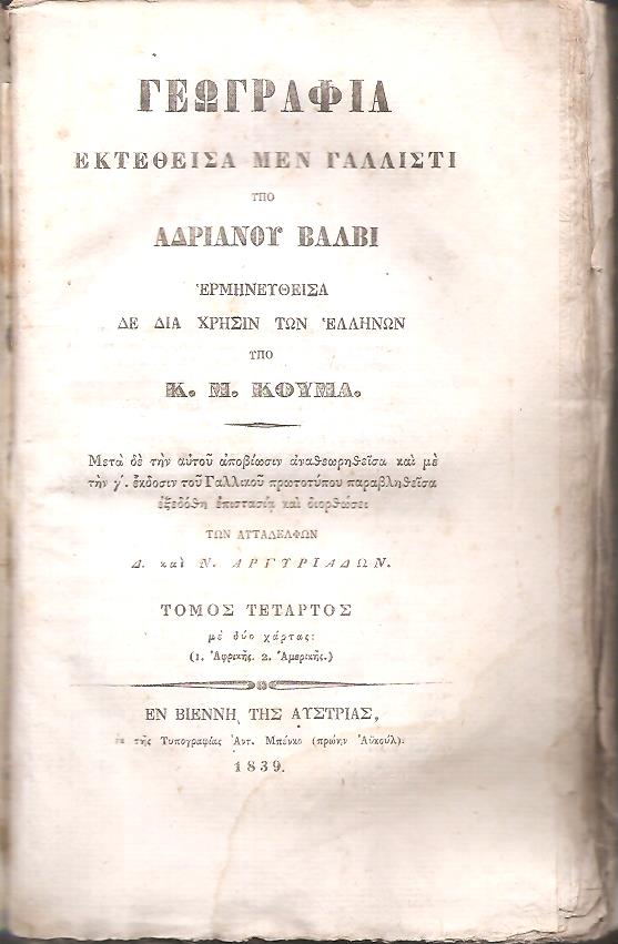 ΒΑΛΒΙΣ ΑΔΡΙΑΝΟΣ, Γεωγραφία εκτεθείσα μεν γαλλιστί, ερμηνευθείσα δε διά χρήσιν των Ελλήνων υπό Κ. Μ. ΚΟΥΜΑ. Τόμος Δ΄. Μετά δε την αυτού αποβίωσιν αναθεωρηθείσα και με την γ΄. έκδοσιν του Γαλλικού πρωτοτύπου παραβληθείσα εξεδόθη επιστασία και διορθώσει των Αυταδέλφων Δ. και Ν. ΑΡΓΥΡΙΑΔΩΝ. Εν Βιέννη της Αυστρίας, εκ της Τυπογραφίας Αντ. Μπένκο (πρώην Αϋκούλ), 1839, 8ο, σελ. κή+561+3χ.α.+2αναδιπλ. χάρτες (ΓΚΙΝΗΣ-ΜΕΞΑΣ αρ. 3097, ΗΛΙΟΥ-ΠΟΛΕΜΗ αρ. 1839.27, λείπει το οπισθόφυλλο. Ο τόμος αυτός περιέχει την φυσική γεωγραφία, την πολιτική κατάσταση και πολιτειογραφικούς πίνακες των Ηπείρων Αφρικής και Αμερικής. Ο ένας έγχρωμος αναδιπλούμενος χάρτης είναι της Αφρικής, λείπει ο χάρτης της Αμερικής. Ο δεύτερος έγχρωμος αναδιπλούμενος χάρτης είναι των δύο ημισφαιρίων και είναι από τον πρώτο τόμο)