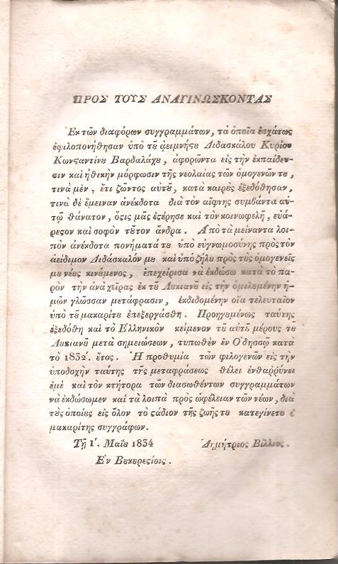 ΛΟΥΚΙΑΝΟΣ ΣΑΜΟΣΑΤΕΥΣ, Διάλογοι ΄Ητοι οι νεκρικοί, και ο Χάρων, ή επισκοπούντες, και ο Τίμων, ή Μισάνθρωπος. Μεταφρασθέντες εις την ομιλουμένην Γραικικήν γλώσσαν υπό Κωνσταντίνου Βαρδαλάχου εκδοθέντες δε υπό Δημητρίου Βιλλίου. Εν Βουκουρεστίοις, Εκ του Τυπογραφείου Ι. Ηλιάδου, 1834, 8ο, σελ. 162+5χ.α.+1λ (ΓΚΙΝΗΣ-ΜΕΞΑΣ αρ. 2394, ΗΛΙΟΥ αρ. 1834.76)