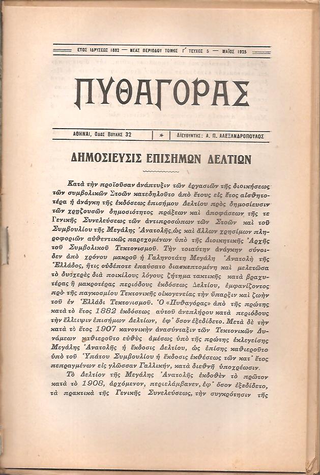 «ΠΥΘΑΓΟΡΑΣ» Νέα περίοδος, τόμος Γ΄, 1925, τεύχη 1-12. Περιοδικόν Ε∴ Τ∴ Εκδιδόμενον εν Αθήναις κατά μήνα. Ιδρυτής Εμμανουήλ Γαλάνης, Διευθυντής Α. Αλεξανδρόπουλος. Εν Αθήναις 1925, 8ο, σελ. [737]-1104 (άκοπα φύλλα, πλήρης τόμος χωρίς εξώφυλλα)