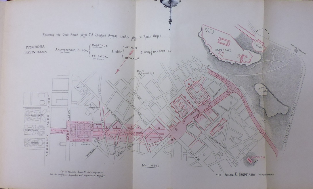 ΓΕΩΡΓΙΑΔΗΣ ΑΘΑΝΑΣΙΟΣ Σ., Μελέτη νέας λεωφόρου εν τη πόλει, Περικλέους και Ασπασίας, ήτοι επέκτασις της οδού Κοραή μέχρι του σιδηροδρομικού σταθμού Μοναστηρίου (Αγοράς) και εκείθεν μέχρι του Αρείου Πάγου. Μετά προκαταμετρήσεως και προϋπολογισμού της κατασκευής της νέας λεωφόρου και σχεδίου. Εν Αθήναις 1908, 4ο, σελ. 19+2 αναδ. σχέδια.