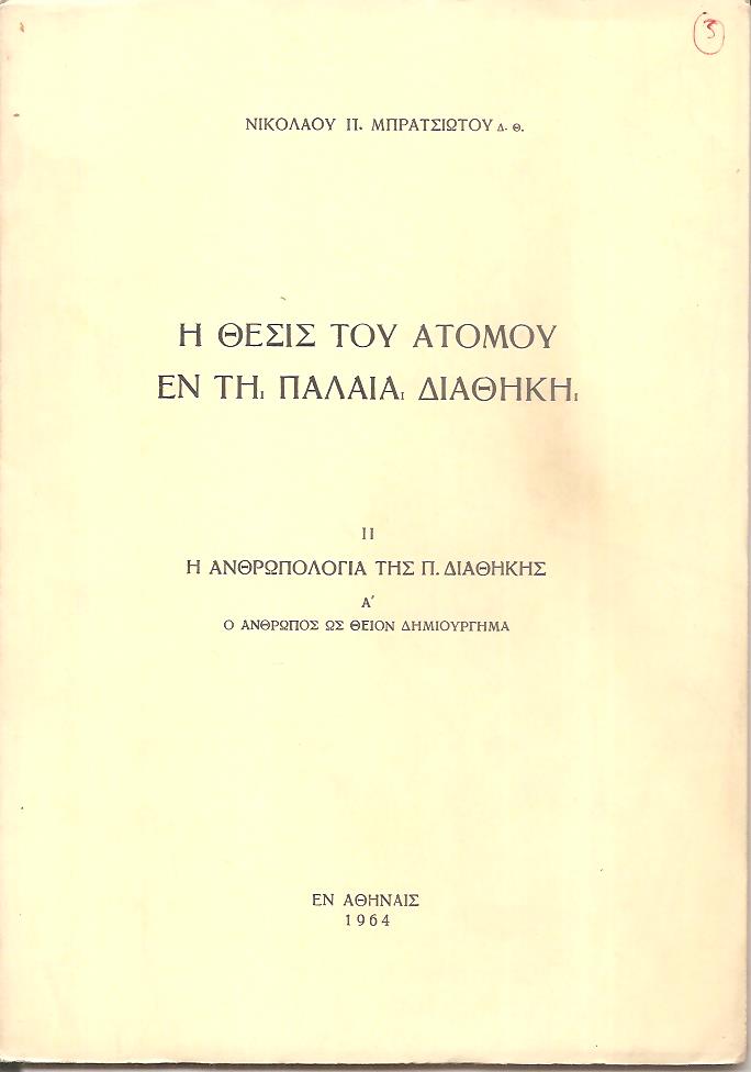 ΜΠΡΑΤΣΙΩΤΗΣ ΝΙΚΟΛΑΟΣ Π., Η θέσις του ατόμου εν τη Παλαιά Διαθήκη Ι. Εισαγωγικά, το πρόβλημα - ιστορική επισκόπησις ερεύνης, το άτομον εν τη αρχαία εγγύς ανατολή. II. Η ανθρωπολογία της Π. Διαθήκης, Α΄ ο άνθρωπος ως θείον δημιούργημα. Εν Αθήναις 1962-1964, 8ο, σελ. 232+59