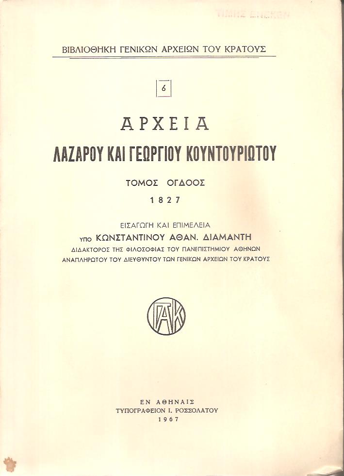 ΒΙΒΛΙΟΘΗΚΗ ΓΕΝΙΚΩΝ ΑΡΧΕΙΩΝ ΤΟΥ ΚΡΑΤΟΥΣ, Αρχεία Λάζαρου και Γεωργίου Κουντουριώτου. Τόμοι 5 (1793-1832). Οι τόμοι 6ος, 7ος, 8ος, 9ος και 10ος. Εισαγωγή, επιμέλεια και σημειώσεις υπό Εμμαν. Γ. Πρωτοψάλτη και Κωνσταντίνου Αθαν. Διαμαντή. Εν Αθήναις 1966 - 1969, 8o, σ. 412+606+480+576+592 (πλήρη σειρά, οι τέσσερις τόμοι με άκοπα φύλλα)