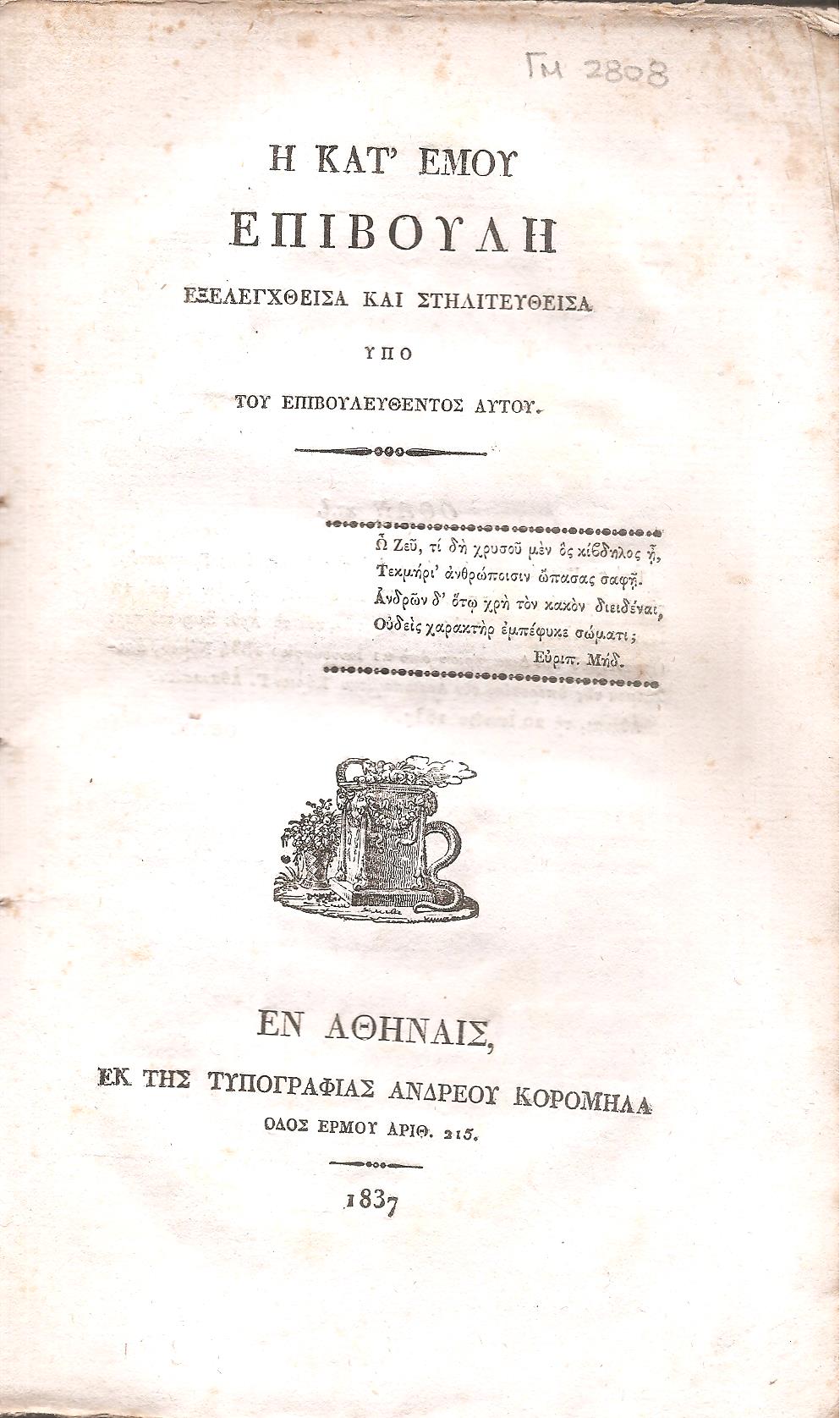 ΑΝΩΝΥΜΟΣ, Η κατ’ εμού επιβουλή , εξελεγχθείσα και στηλιτευθείσα υπό του επιβουλευθέντος αυτού . Εν Αθήναις, ΕΚ ΤΗΣ ΤΥΠΟΓΡΑΦΙΑΣ ΑΝΔΡΕΟΥ ΚΟΡΟΜΗΛΑ, 1837, 8ο, σελ. 2χ.α.+ ι΄+30+2λ (αντίτυπο σε πολύ καλή κατάσταση, στη σ. ή υπογράφει: Γ. Αθανασίου, ΓΚΙΝΗΣ- ΜΕΞΑΣ αρ. 2808)