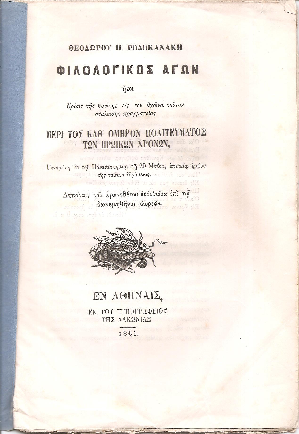 ΡΟΔΟΚΑΝΑΚΗΣ ΘΕΟΔΩΡΟΣ Π., Φιλολογικός Αγών ήτοι Κρίσις της πρώτης εις τον αγώνα τούτον σταλείσης πραγματείας ΠΕΡΙ ΤΟΥ ΚΑΘ’ ΟΜΗΡΟΝ ΠΟΛΙΤΕΥΜΑΤΟΣ ΤΩΝ ΗΡΩΪΚΩΝ ΧΡΟΝΩΝ, Γενομένη εν τω Πανεπιστημίω τη 20 Μαΐου, επετείω ημέρα της τούτου ιδρύσεως. Δαπάναις του αγωνοθέτου εκδοθείσα επί τω διανεμηθήναι δωρεάν. Εν Αθήναις, Εκ του Τυπογραφείου της Λακωνίας. 1861, 8ο, σελ. 35+1λ. (άκοπα φύλλα, ΓΚΙΝΗΣ- ΜΕΞΑΣ αρ. 8674)