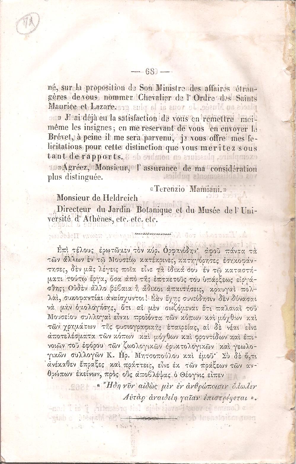 ΧΕΛΔΡΑΪΧ Θ. δε (Heldreich Theodor von), Γενικού Επιμελητού του φυσιογραφικού Μουσείου του Εθνικού Πανεπιστημίου, Απάντησις εις το υπό του Καθηγητού Θ. Γ. Ορφανίδου δημοσιευθέν φυλλάδιον το επιγραφόμενον «Η Κατάστασις του φυσιογραφικού Μουσείου του Πανεπιστημίου». Εν Αθήναις, ΕΚ ΤΟΥ ΤΥΠΟΓΡΑΦΕΙΟΥ ΑΓ. ΚΑΝΑΡΙΩΤΟΥ, 1865, 8ο, σελ. 68 (απόδετο, χωρίς εξώφυλλο, ΗΛΙΟΥ-ΠΟΛΕΜΗ αρ. 1865.36)
