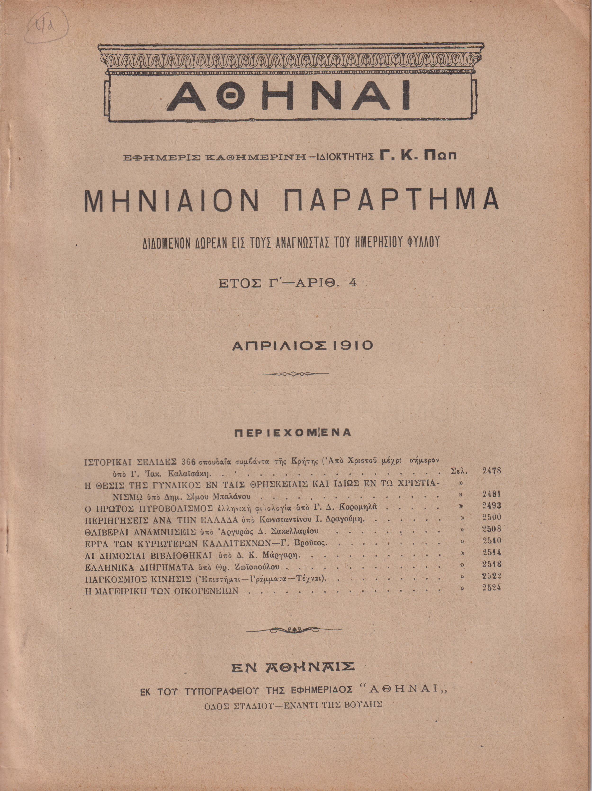 ΑΘΗΝΑΙ-Μηνιαίον παράρτημα έτος Γ΄,τεύχη αρ. 1-12[Ιανουάριος-Δεκέμβριος 1910]