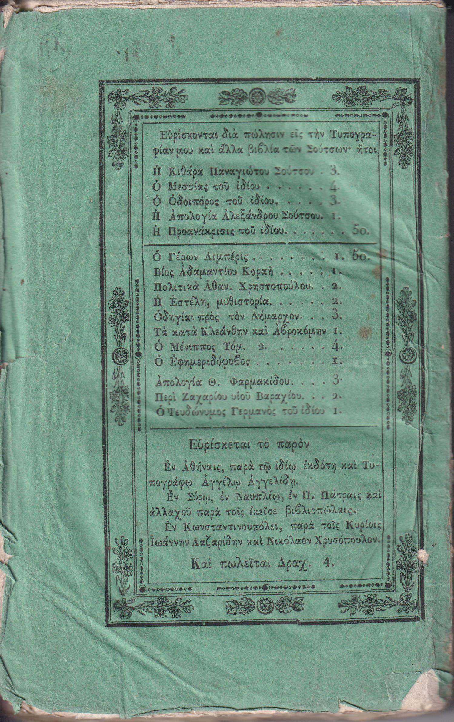 ΣΟΥΤΣΟΣ ΠΑΝΑΓΙΩΤΗΣ, Τρία Λυρικά Δράματα, εις ά προστίθεται και Ωδή τις εις τον Ναπολέοντα ποιηθείσα υπό του αυτού. Εκδοθέντα υπό ΑΓΓΕΛΟΥ ΑΓΓΕΛΙΔΟΥ . Εν Αθήναις, ΕΚ ΤΗΣ ΤΥΠΟΓΡΑΦΙΑΣ ΑΓΓΕΛΟΥ ΑΓΓΕΛΙΔΟΥ, 1842, 8ο, σελ. 6χ.α.+242+2λ+1χ.α+[243]-255+1λ+1χ.α.+1λ (αντίτυπο σε αρκετά καλή κατάσταση, ταλαιπωρημένο εξώφυλλο, τα δράματα: Ό ΄Αγνωστος, ο Γεώργιος Καραϊσκάκης και Οδοιπόρος. ΓΚΙΝΗΣ-ΜΕΞΑΣ αρ. 3679 & ΗΛΙΟΥ αρ. 1842.163)