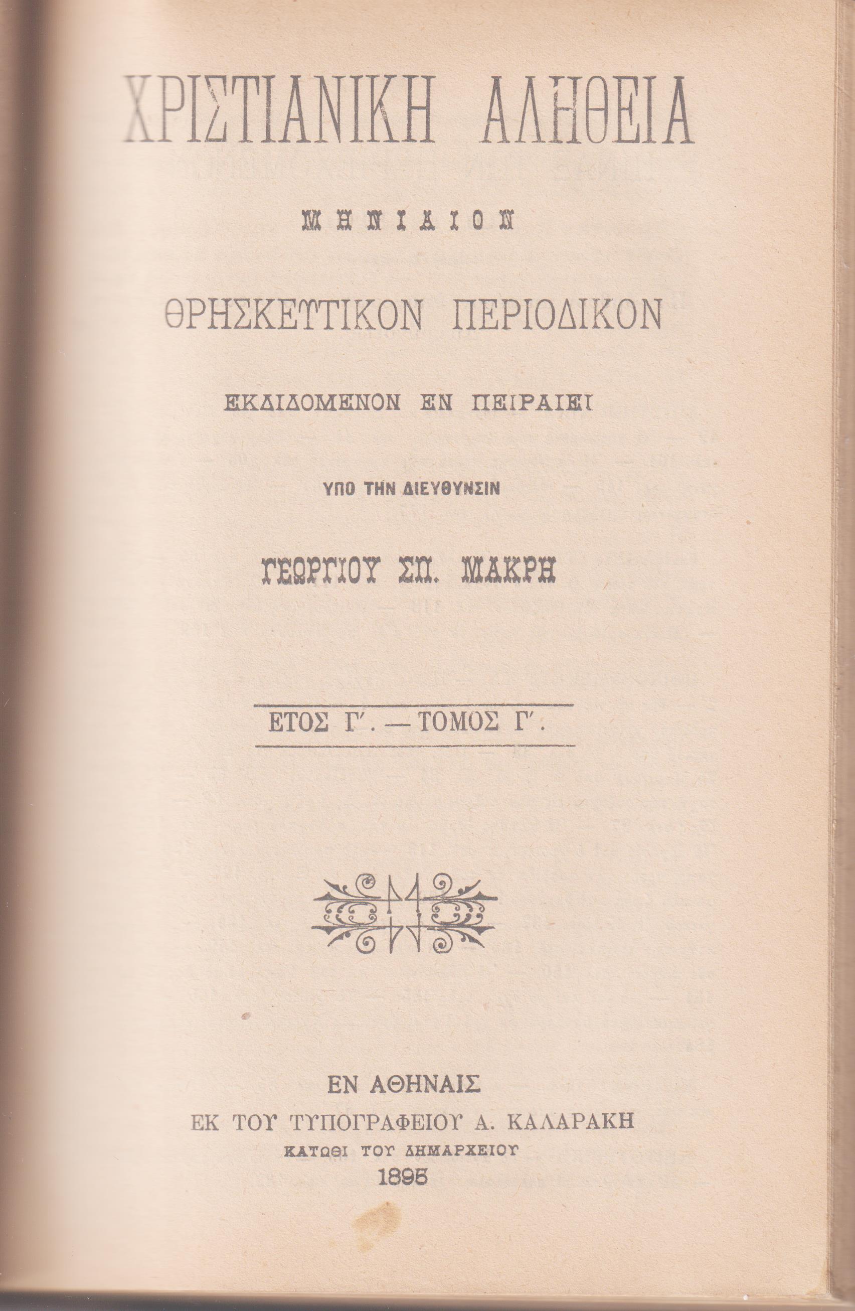 ΧΡΙΣΤΙΑΝΙΚΗ ΑΛΗΘΕΙΑ 1893-1897, τόμοι Α΄-Ε΄, Μηνιαίον Θρησκευτικόν περιοδικόν εκδιδόμενον εν Πειραιεί υπό την Διεύθυνσιν Γεωργίου Σπ. Μακρή. Εν Αθήναις, ΕΚ ΤΟΥ ΤΥΠΟΓΡΑΦΕΙΟΥ Α. ΚΟΛΛΑΡΑΚΗ και Ν. ΤΡΙΑΝΤΑΦΥΛΛΟΥ, 1893-1897, 8ο, σελ. τ. Α΄, δ΄+192+τ. Β΄, δ΄+192+τ. Γ΄, δ΄+192+τ. Δ΄, δ΄+192+τ. Ε΄, δ΄+160 (τα πέντε[5] έτη δεμένα σ’ ένα τόμο δερματόδετο[μαύρο] εποχής, η βιβλιοδεσία ελαφρώς ταλαιπωρημένη, το αντίτυπο σε καλή κατάσταση. Στο τόμο Α΄ οι σελίδες γ΄-δ΄ είναι ραμμένες από τον βιβλιοδέτη σε λάθος θέση)