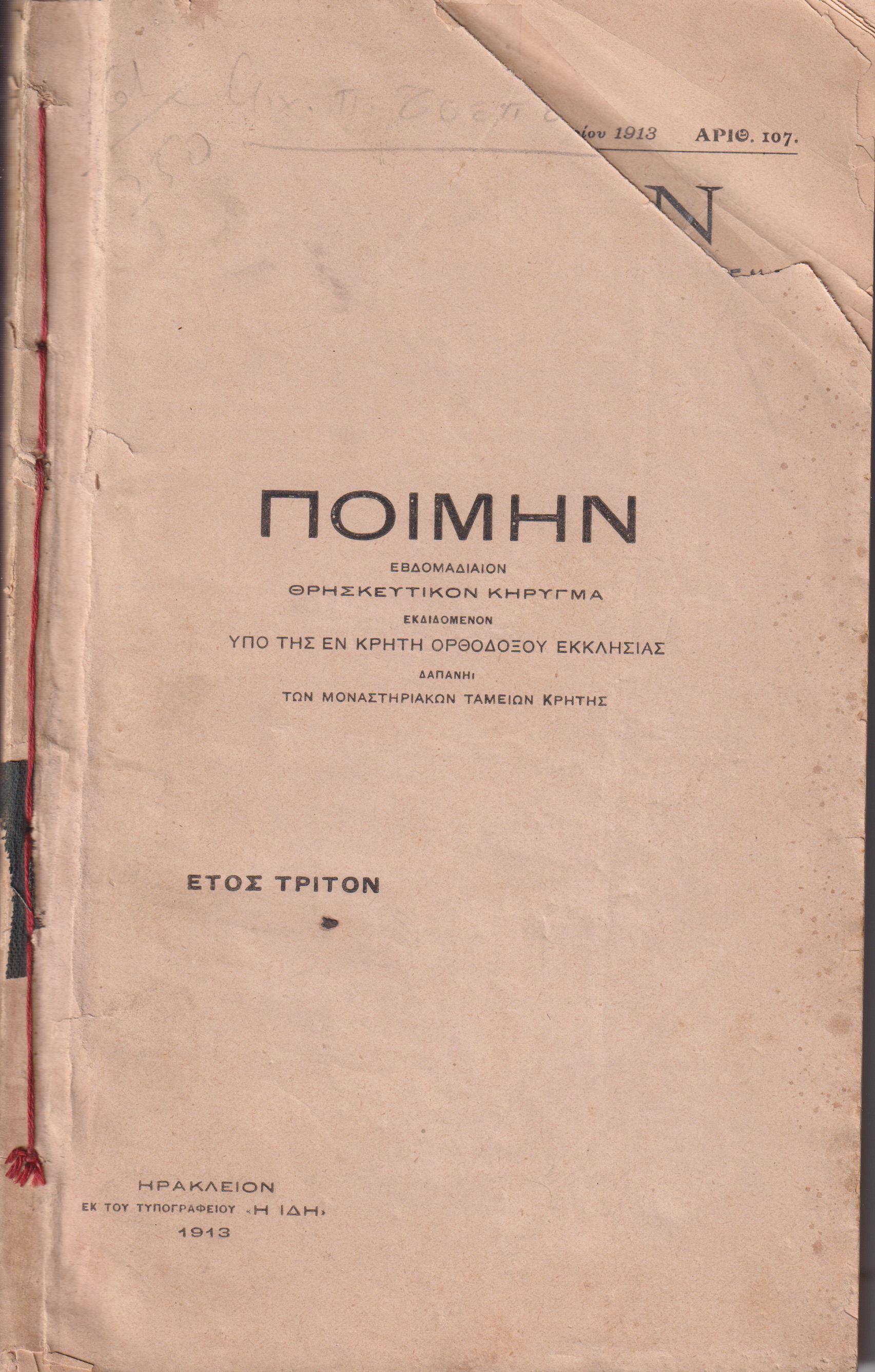 ΠΟΙΜΗΝ, Έτος Γ΄ 1913, τεύχη: αρ. 107 [6 Ιανουαρίου 1913] έως αρ. 158 [29 Δεκεμβρίου 1913] Εβδομαδιαίον θρησκευτικόν κήρυγμα, εκδιδόμενο υπό της εν Κρήτη Ορθοδόξου Εκκλησίας, δαπάνη των μοναστηριακών ταμείων Κρήτης. Εν Ηρακλείω Κρήτης, Τυπογραφείο «ΙΔΗ», 1913, 8ο, σελ [885]-1286 (απόδετο, λείπει κομμάτι από τον ψευδότιτλο, αποκομμένο το οπισθόφυλλο)