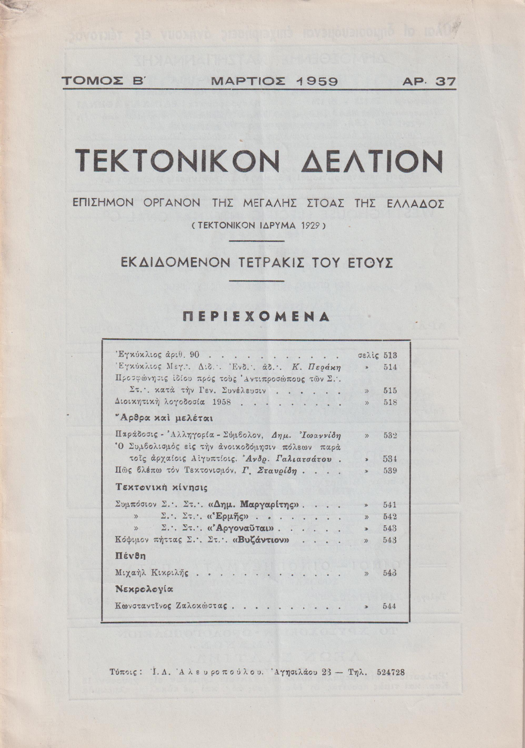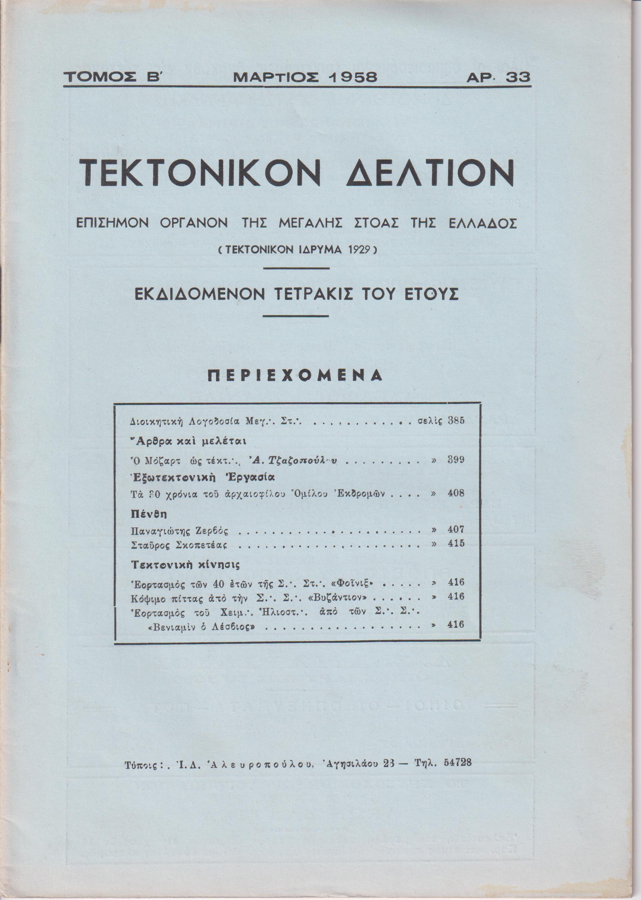 ΤΕΚΤΟΝΙΚΟΝ ΔΕΛΤΙΟΝ, Τόμος Β΄, 1955-1959, Επίσημον Όργανον της Μεγάλης Στοάς της Ελλάδος (Τεκτονικόν ΄Ιδρυμα 1929), εκδίδεται τετράκις του έτους. Υπεύθυνος Συντάκτης : .Α. ΡΑΜΜΟΣ. Επιτροπή ΄Υλης: Θ. ΒΛΗΣΙΔΗΣ, Ι. ΒΑΣΙΛΗΣ, Π. ΓΛΕΖΟΣ. Αθήναι 1955-59, 8ο .΄Ετος 1955, αρ. 21[Μάρτιος 1955, σ. 32], αρ. 22[Ιούνιος 1955, σ. 33-64]. Υπ. Σύντ.: Π. ΧΑΤΖΗΠΕΤΡΟΣ. αρ. 23[Σεπτέμβριος 1955, σ. 65-96], αρ. 24[Δεκέμβριος 1955, σ. 97-128, ΠΛΗΡΕΣ ΕΤΟΣ. ΄Ετος 1956, Επιτροπή ΄Υλης: Θ. ΒΛΗΣΙΔΗΣ, Ν. ΜΑΛΑΓΑΡΔΗΣ, Π. ΓΛΕΖΟΣ. λείπει το 1ο τεύχος αρ.25[Μάρτιος 1956], αρ. 26[Ιούνιος 1956, σ. 161-192], αρ. 27[Σεπτέμβριος 1956, σ. 193-224], αρ. 28[Δεκέμβριος 1956, σ. 225-256. ΄Ετος 1957. Υπ. Σύντ.: Π. ΧΑΤΖΗΠΕΤΡΟΣ. Επιτροπή ΄Υλης: Θ. ΒΛΗΣΙΔΗΣ, Ν. ΠΑΛΑΙΟΛΟΓΟΠΟΥΛΟΣ, Π. ΓΛΕΖΟΣ. αρ.29[Μάρτιος 1957, σ. 257-288], αρ. 30[Ιούνιος 1957, σ. 289-320], αρ. 31[Οκτώβριος 1957, σ. 321-352], αρ. 32[Δεκέμβριος 1957, σ. 353-384, ΠΛΗΡΕΣ ΕΤΟΣ. ΄Ετος 1958, αρ. 33[Μάρτιος 1958, σ. 385-416], αρ. 34[Ιούνιος 1958, σ. 417-448], αρ. 35[Σεπτέμβριος 1958, σ. 449-480], αρ. 36[Δεκέμβριος 1958, σ. 481-512], ΠΛΗΡΕΣ ΕΤΟΣ. ΄Ετος 1959, αρ. 37[Μάρτιος 1959, σ. 513-544], αρ. 38[Ιούνιος 1959, σελ. 545-576]. Επιτροπή ΄Υλης: Ν. ΠΑΛΑΙΟΛΟΓΟΠΟΥΛΟΣ, Π. ΓΛΕΖΟΣ, Π. ΣΤΕΦΑΝΟΠΟΥΛΟΣ, αρ. 39[Σεπτέμβριος 1959, σελ. 577-608], αρ. 40[Δεκέμβριος 1959, σ. 609-640], ΠΛΗΡΕΣ ΕΤΟΣ. . Σύνολον 19 τεύχη με τα εξώφυλλά τους