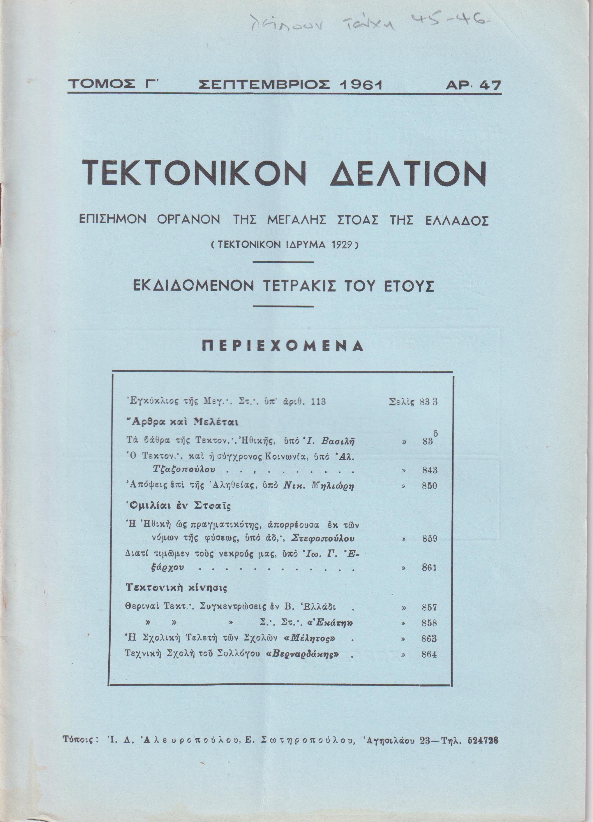 ΤΕΚΤΟΝΙΚΟΝ ΔΕΛΤΙΟΝ, Τόμος Γ΄, 1960-1961, Επίσημον Όργανον της Μεγάλης Στοάς της Ελλάδος (Τεκτονικόν ΄Ιδρυμα 1929), εκδίδεται τετράκις του έτους. Υπεύθυνος Συντάκτης: Π. ΧΑΤΖΗΠΕΤΡΟΣ. Επιτροπή ΄Υλης: Ν. ΠΑΛΑΙΟΛΟΓΟΠΟΥΛΟΣ, Ν. ΜΑΛΑΓΑΡΔΗΣ, Π. ΣΤΕΦΑΝΟΠΟΥΛΟΣ . ΄Ετος 1960, αρ. 41[Μάρτιος 1960, σελ. 641-672], αρ. 42[Ιούνιος 1960, σελ. 673-704], 43[Σεπτέμβριος 1960, σελ. 705-736], αρ. 44{Δεκέμβριος 1960, σελ. 737-768], ΠΛΗΡΕΣ ΕΤΟΣ. ΄Ετος 1961, λείπουν τα τεύχη αρ. 45 & 46. Υπεύθυνος Συντάκτης: Π. ΧΑΤΖΗΠΕΤΡΟΣ. Επιτροπή ΄Υλης: Ν. ΠΑΛΑΙΟΛΟΓΟΠΟΥΛΟΣ, Ν. ΜΑΛΑΓΑΡΔΗΣ, Π. ΣΤΕΦΑΝΟΠΟΥΛΟΣ, Α. Γ. ΜΑΡΑΤΟΣ, αρ. 47[Σεπτέμβριος 1961, σελ. φ. 1(διαφημ.)+833-864+1.φ(διαφημ.), αρ. 48[Δεκέμβριος 1961, σελ. 865-896]. Σύνολον 6 τεύχη με τα εξώφυλλά τους.