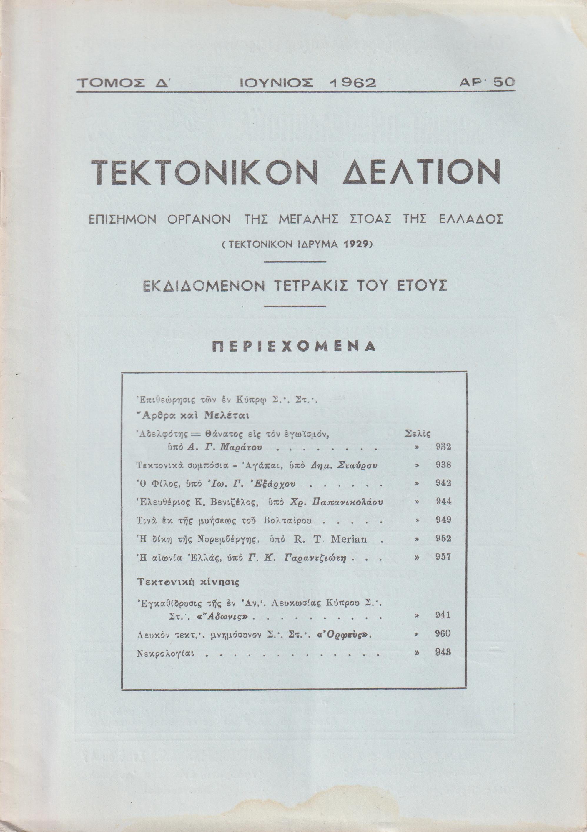 ΤΕΚΤΟΝΙΚΟΝ ΔΕΛΤΙΟΝ, Τόμος Δ΄, 1962, Επίσημον Όργανον της Μεγάλης Στοάς της Ελλάδος (Τεκτονικόν ΄Ιδρυμα 1929), εκδίδεται τετράκις του έτους. Υπεύθυνος Συντάκτης: Π. ΧΑΤΖΗΠΕΤΡΟΣ. Επιτροπή ΄Υλης: Ν. ΜΑΛΑΓΑΡΔΗΣ, Ν. ΠΑΛΑΙΟΛΟΓΟΠΟΥΛΟΣ, Π. ΣΤΕΦΑΝΟΠΟΥΛΟΣ, Α. Γ. ΜΑΡΑΤΟΣ, αρ. 49 [Μάρτιος 1962, σ. 897-928], αρ. 50[Ιούνιος 1962, σ. 929-960], αρ. 51-52[Σ/βριος-Δεκ/βριος 1962, σ. 961-1016], ΠΛΗΡΕΣ ΕΤΟΣ. Σύνολον 3 τεύχη με τα εξώφυλλά τους, το ένα διπλό.