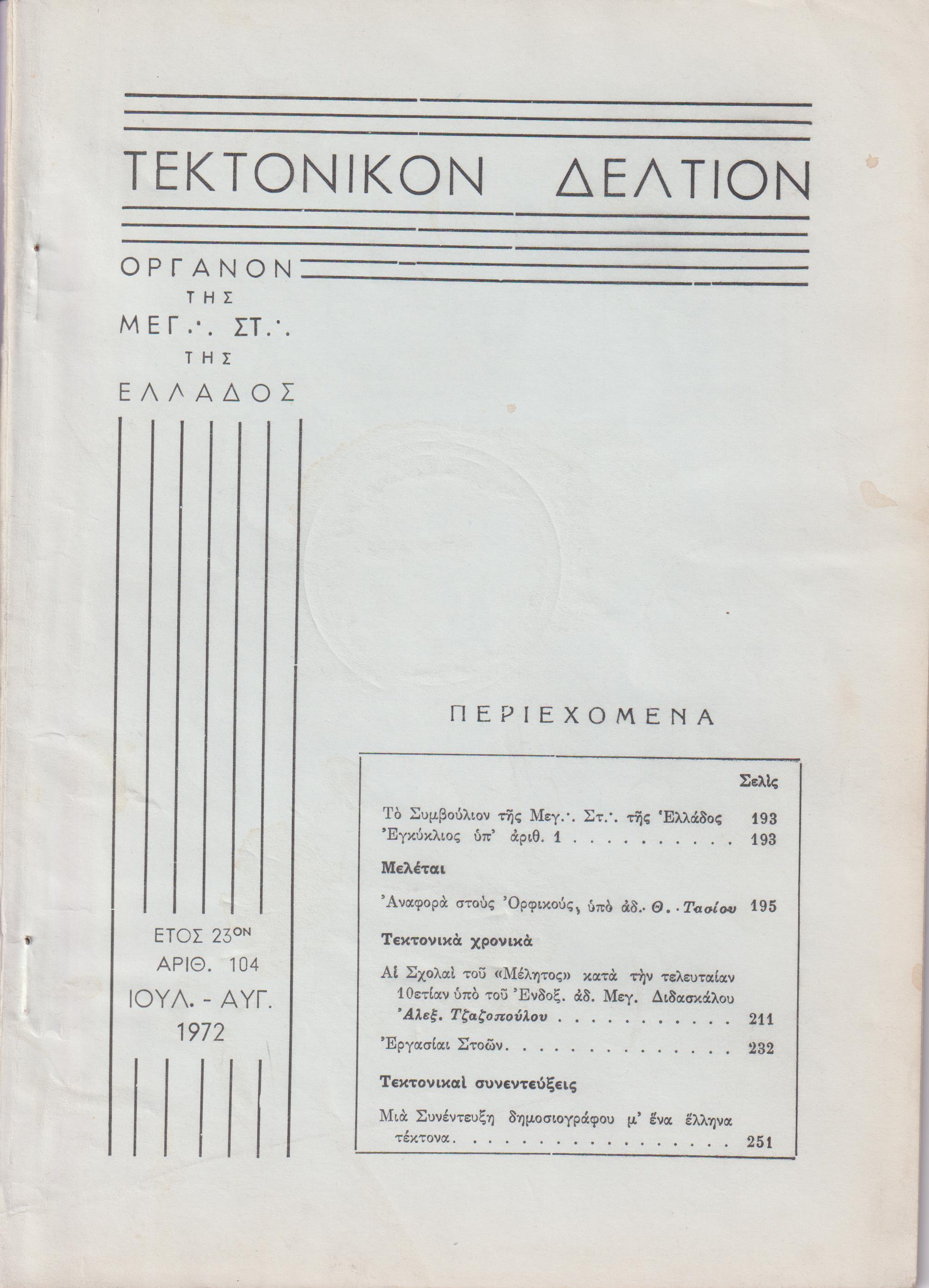 ΤΕΚΤΟΝΙΚΟΝ ΔΕΛΤΙΟΝ, 1972, έτος 23ον, ΄Οργανον της Μεγάλης Στοάς της Ελλάδος. Υπεύθυνος: Ε. ΜΑΚΡΥΜΙΧΑΛΟΣ. Συντακτ. Επιτροπή: Π. Γ. ΚΡΗΤΙΚΟΣ, Ν. ΜΗΛΙΩΡΗΣ, Φ. ΦΑΛΜΠΟΣ, Α. ΖΕΡΒΟΥΔΑΚΗΣ, Ξ. ΧΑΤΖΗΣΑΡΑΝΤΟΣ. Αθήναι 1972, 8ο, σελ. 381; αρ.103[Μάϊος.-Ιούν. 1972, σελ. 129-192], αρ. 104[Ιούλ.-Αύγ. 1972, σελ. 193-256], αρ. 105-106[Σεπτ.-Δεκ. 1972, σελ. 257-381+1χ.α.]. Λείπουν τα τεύχη 101-102