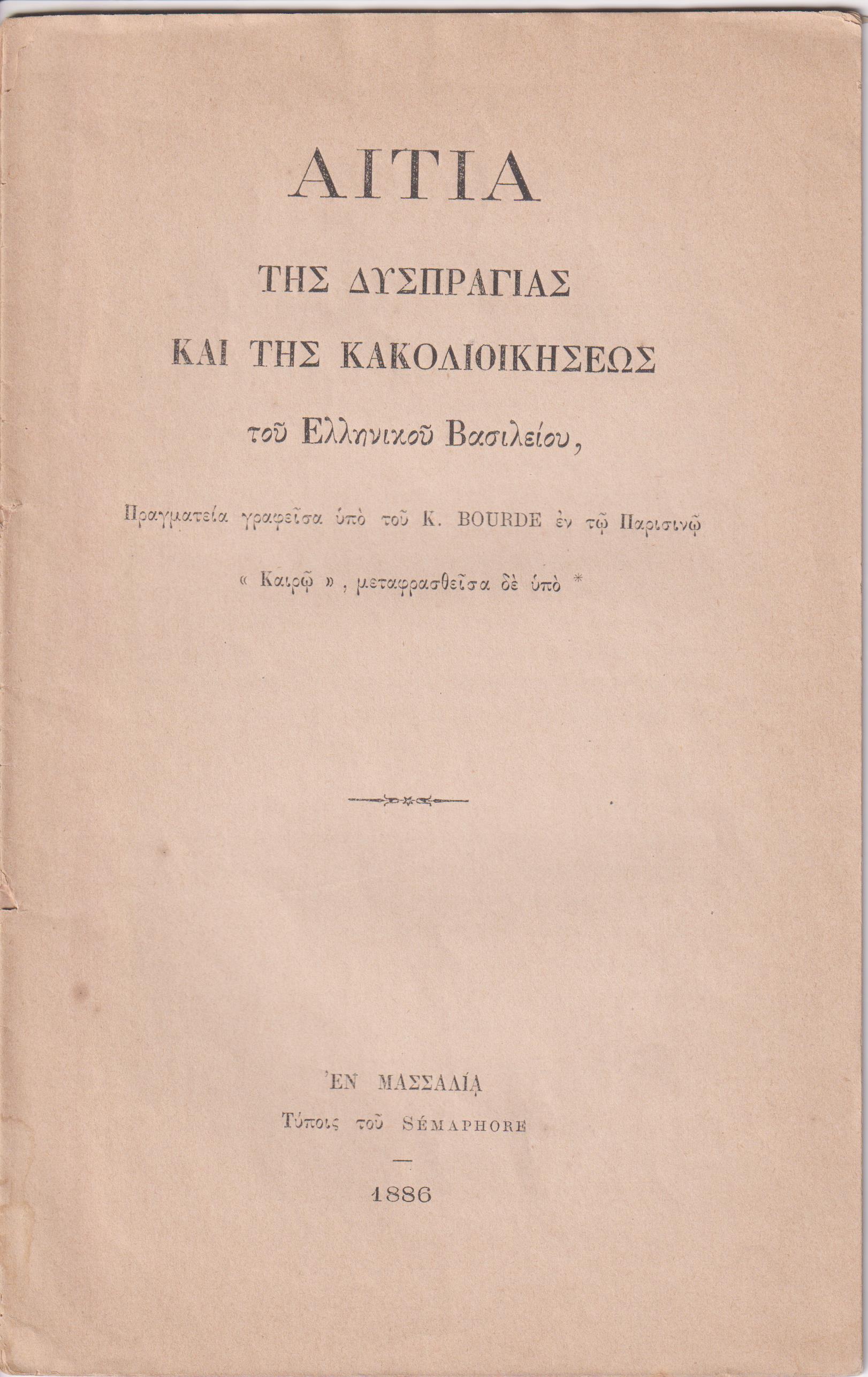 BOURDE K., Αίτια της δυσπραγίας και της κακοδιοικήσεως του Ελληνικού Βασιλείου. Πραγματεία γραφείσα υπό του K. BOURDE εν τω Παρισινώ «Καιρώ», μεταφρασθείσα δε υπό *. Εν Μασσαλία, Τύποις του SEMAPHORE, 1886, 8ο, σελ. 32 (ΗΛΙΟΥ-ΠΟΛΕΜΗ αρ. 1886.17)