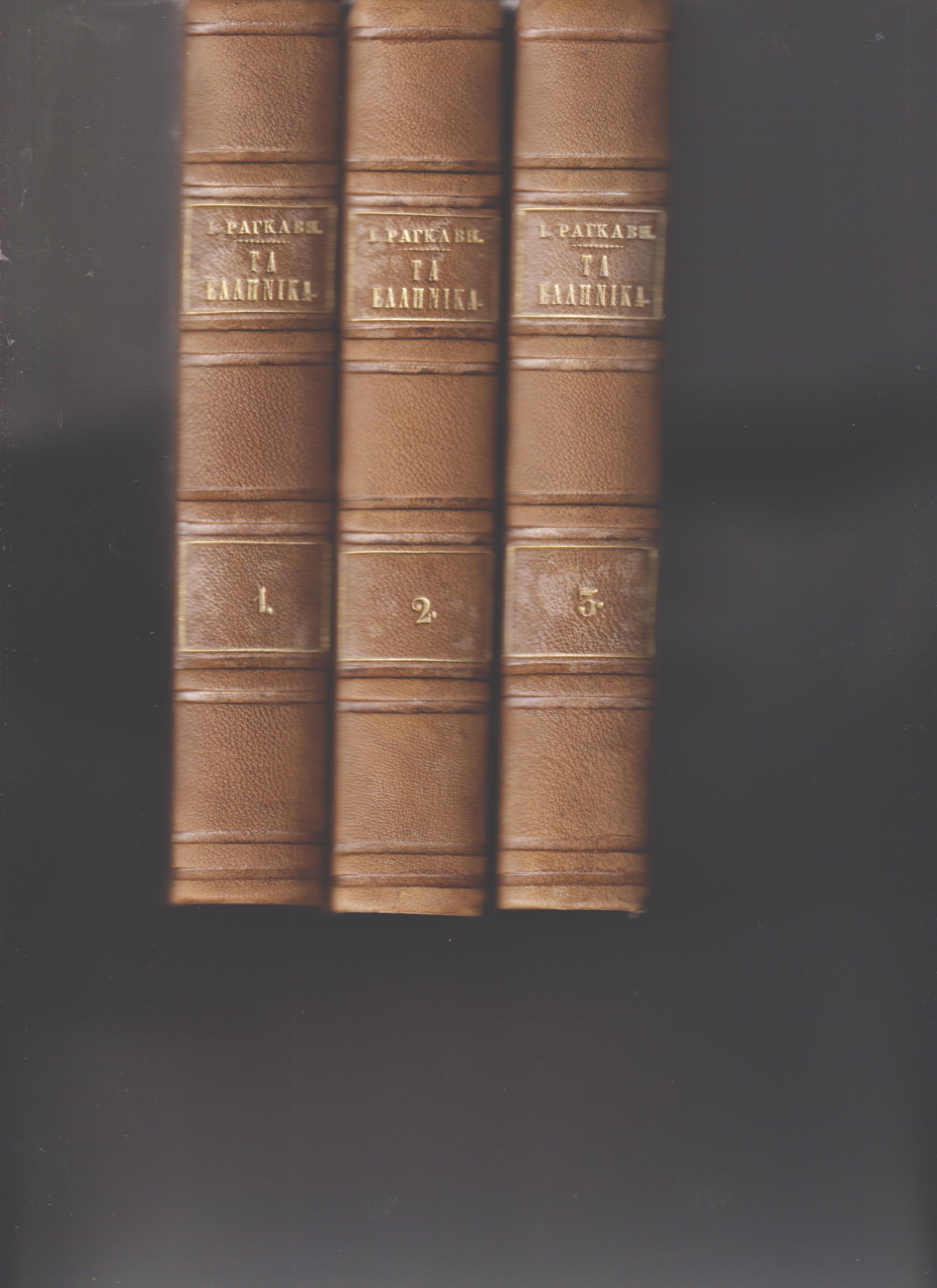 ΡΑΓΚΑΒΗΣ ΙΑΚΩΒΟΣ Ρ., Τα Ελληνικά (τόμοι 1-3) ήτοι Περιγραφή Γεωγραφική, Ιστορική, Αρχαιολογική, και Στατιστική της Αρχαίας και Νέας Ελλάδος. Εις τρεις τόμους. Ων ο Α΄. Διαλαμβάνει την Στερεάν, Ανατολικήν και Δυτικήν Ελλάδα, ο Β΄. Την Πελοπόννησον και ο Γ΄. Τας Νήσους τας τε ελευθέρας και μη, και τον πίνακα, και εκδοθείσα υπό Κωνσταντίνου Αντωνιάδου. Τόμος 1ος . Εν Αθήναις ΕΚ ΤΟΥ ΤΥΠΟΓΡΑΦΕΙΟΥ Κ. ΑΝΤΩΝΙΑΔΟΥ, 1853, 8ο, σελ. ι΄+784 (ΒΕΦΗ αρ. 1853.347 & ΓΚΙΝΗΣ-ΜΕΞΑΣ αρ. 6135). Τόμος 2ος . Εν Αθήναις ΕΚ ΤΟΥ ΤΥΠΟΓΡΑΦΕΙΟΥ Κ. ΑΝΤΩΝΙΑΔΟΥ, 1853, 8ο, σελ. 736 (ΒΕΦΗ αρ. 1853.348 & ΓΚΙΝΗΣ-ΜΕΞΑΣ αρ. 6135). Τόμος 3ος . Εν Αθήναις ΕΚ ΤΟΥ ΤΥΠΟΓΡΑΦΕΙΟΥ Κ. ΑΝΤΩΝΙΑΔΟΥ, 1854, 8ο, σελ. 791[799]+1λ (ΒΕΦΗ αρ. 1854.237 & ΓΚΙΝΗΣ-ΜΕΞΑΣ αρ. 6354). Οι τρεις τόμοι δερματόδετοι, βιβλιοδεσία νεότερη, χωρίς τα εξώφυλλα. Περιεχόμενο & βιβλιοδεσία σε αρίστη κατάσταση