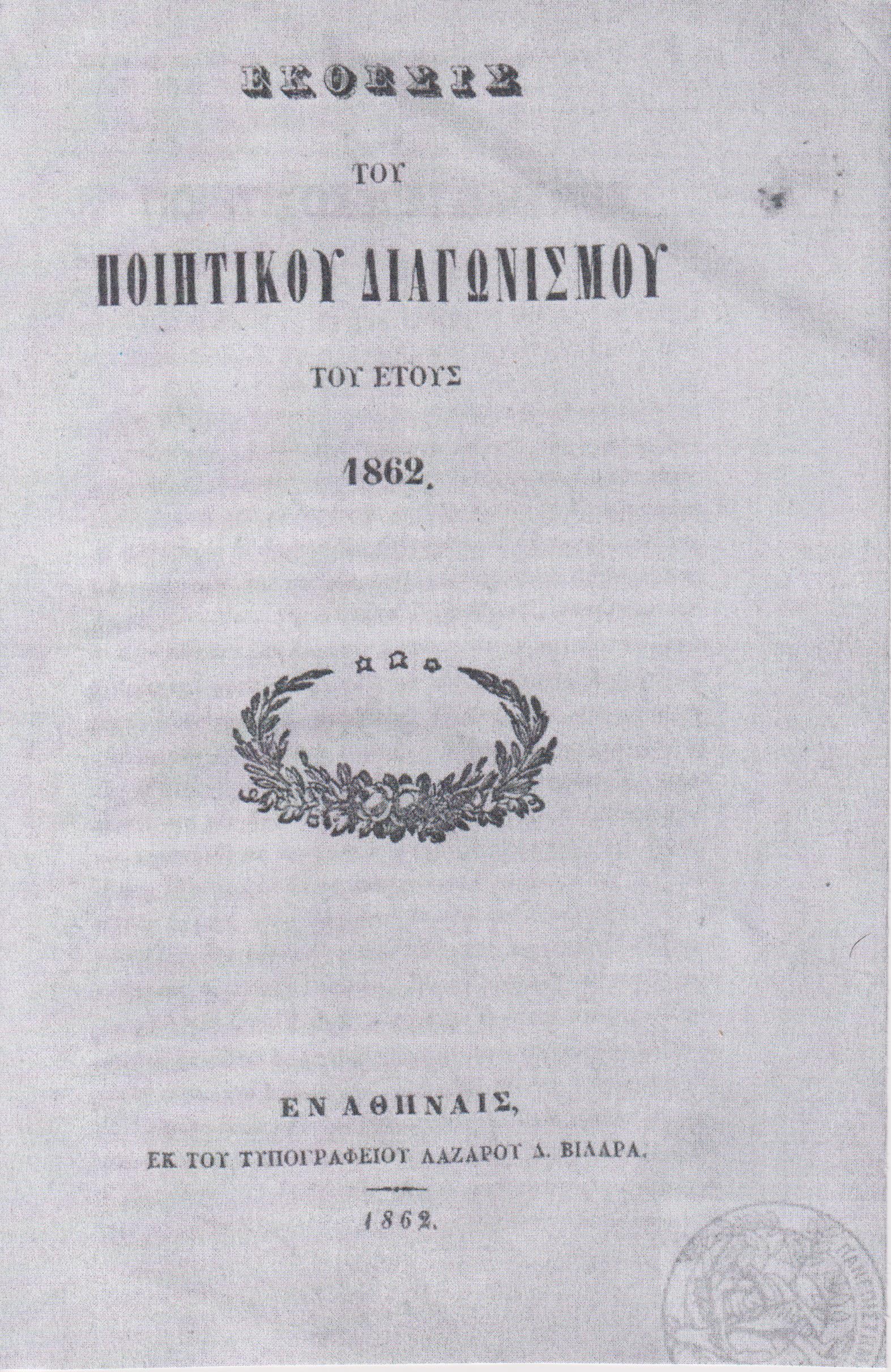ΕΚΘΕΣΙΣ του Ποιητικού Διαγωνισμού του έτους 1862. Εν Αθήναις, ΕΚ ΤΟΥ ΤΥΠΟΓΡΑΦΕΙΟΥ ΛΑΖΑΡΟΥ Δ. ΒΙΛΑΡΑ, 1862, 8ο, σελ. 32 (αντίτυπο ταλαιπωρημένο, λυτό, λείπουν: εξώφυλλο και σελίδα τίτλου, σε αντίγραφα, ΓΚΙΝΗΣ-ΜΕΞΑΣ αρ. 1862.152 & ΓΚΙΝΗΣ-ΜΕΞΑΣ αρ. 9063)
