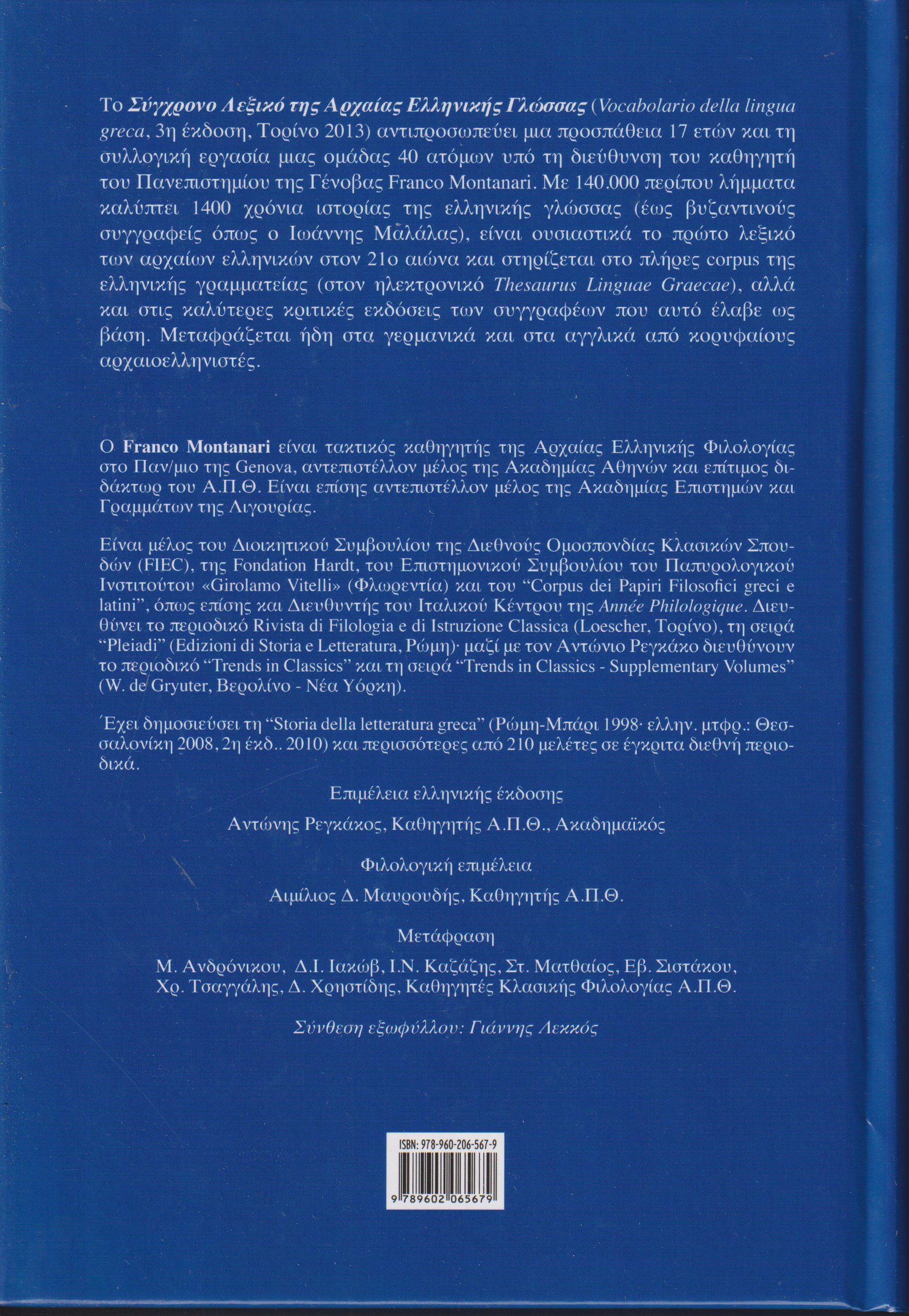 MONTANARI FRANCO, Σύγχρονο Λεξικό της Αρχαίας Ελληνικής Γλώσσας. Επιμέλεια ελληνικής έκδοσης ΑΝΤΩΝΙΟΣ ΡΕΓΚΑΚΟΣ, 3η ΄Εκδοση. Αθήνα, ΕΚΔΟΣΕΙΣ ΔΗΜ. Ν. ΠΑΠΑΔΗΜΑΣ, 2016, 4ο[17Χ24,5], σελ. XVI+2442+4λ (βιομηχανική βιβλιοδεσία εκδότη, ISBN 978-960- 206-567-9)