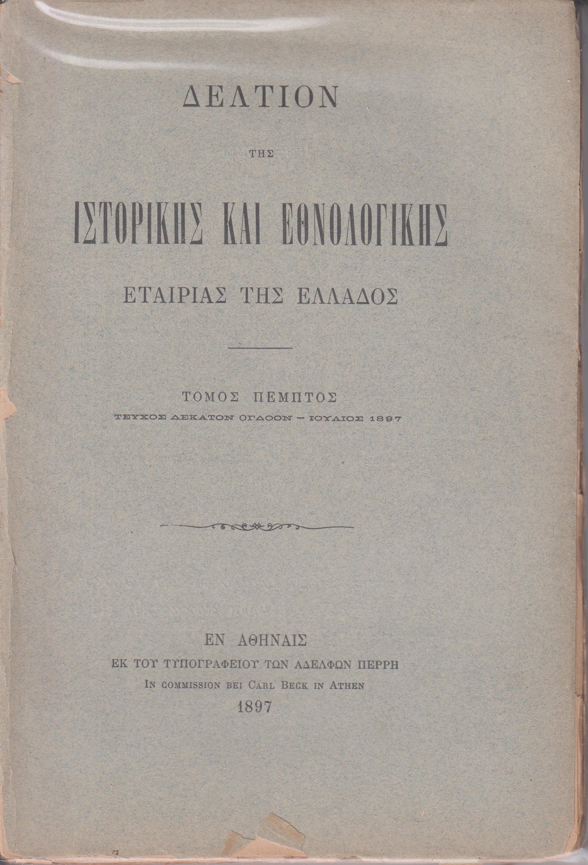ΔΕΛΤΙΟΝ ΤΗΣ ΙΣΤΟΡΙΚΗΣ ΚΑΙ ΕΘΝΟΛΟΓΙΚΗΣ ΕΤΑΙΡΙΑΣ ΤΗΣ ΕΛΛΑΔΟΣ, Τόμος Ε΄, σε τεύχη (1ο[17ο], 2ο[18ο], 3ο[19ο], 4ο[20ο]) πλήρης τόμος άδετος. Εν Αθήναις 1896, 8o, σελ. 828 + ΙΒ΄ πίνακες εκτός κειμένου (από τα περιεχόμενα: ΑΔΑΜΑΝΤΙΟΥ ΑΔΑΜ., Τηνιακά, σ. 277-326. – ΑΛΕΞΟΥΔΗ ΑΝΘΙΜΟΥ, Κατάλογος των εν ταις ιεραίς εκκλησίαις της συνοικίας Κάστρου, πόλεως Βερατίου της Μητροπόλεως Βελεγρλαδων ευρισκομένων αρχαίων χειριγράφων, σ. 352-369. – ΔΑΣΣΑΡΗΤΟΥ ΗΛΙΑ, Περί της Κοριτσάς, σ. 123-158. – ΔΙΑΜΑΝΤΑΡΑ Α., Ολίγα περί της εν Μεγίστη Μονής του Αγ. Γεωργίου, σ. 252-258. – ΖΩΗ Λ. Χ., Ιστορικαί σελίδες εκ της Ελληνικής Επαναστάσεως, σ. 259-262. – ΛΑΜΠΡΟΥ ΣΠΥΡ. Π., Γεωργίου του Αιτωλού Μύθοι, νυν το πρώτον εκδιδόμενοι, σ. 1-102. - του ιδίου: Αγιορειτικά απόγραφα του Σπανέα, νυν το πρώτον εκδιδόμενοι, σ. 103-122. - του ιδίου: Ταβουλλαρικόν γράμμα του ΙΔ΄αιώνος, σ. 159-160. - του ιδίου: Δύο εκθέσεις περί Αθηνών περί τα τέλη του 17ου αιώνος, σ. 219-227. - του ιδίου: Η περί Πελοποννήσου έκθεσις του Βενετού Προνοητού Γραδενίγου, σ. 228-251. - του ιδίου: Εκθέσεις των Βενετών Προνοητών της Πελοποννήσου εκ των εν Βενετία αρχείων, σ. 425-567 & 605-823, - του ιδίου: Ενετίησι= εν έτει, σ. 572. – ΜΕΝΑΡΔΟΥ ΣΙΜΟΥ, Κυπριώτικα τραγούδια, σ. 277-326. – ΚΩΝΣΤΑΝΤΙΝΙΔΟΥ Γ., Δύο ιστορικά έγγραφα σχετικά προς την ιστορίαν των Αθηνών επί της καταλανοκρατίας, σ. 824-827. – ΚΩΣΤΗ Ν. Κ. Χ., Ανέκδοτοι επιστολαί Κοραή και προς Κοραήν, σ. 263-276. – ΣΑΡΡΟΥ Δ. Μ., Λείψανα της λατρείας του Λίνου και Αδώνιδος εν Ηπείρω, σ. 347-351, του ιδίου: Χρονογραφικά σημειώματα αναφερόμενα εις την νεωτέραν ιστορίαν της Ηπείρου και της ηγεμονίας της Βλαχίας, εξ ανεκδότου συλλογής, σ. 568-571. ΤΡΟΫ ΜΑΞ, Περί Ευθυμίου Νέων Πατρών του Μαλάκη, σ. 196-218. – ΦΙΛΗΤΑ Χ., Περί του συνοικισμού των Γραικών εν Τεργέστη, σ. 370-376. – ΙΣΤΟΡΙΚΗ ΚΑΙ ΕΘΝΟΛΟΓΙΚΗ ΕΤΑΙΡΙΑ ΤΗΣ ΕΛΛΑΔΟΣ, Πρακτικά της ΙΣΤ΄ Γενικής Συνόδου της 19 Μαΐου 1896, σ. 161-196. – ΙΕΕΕ, Πρακτικά της ΙΖ΄ Γενικής Συνόδου της 3 Μαΐου 1898, σ. 377-424. – ΙΕΕΕ, Πρακτικά της ΙΗ΄ Γενικής Συνελεύσεως των Εταίρων της 23 Μαΐου 1899, σ. 573-604). Τα 4 τεύχη άδετα, λυτά, άκοπα φύλλα, ταλιπωρημένο το 1ο τεύχος