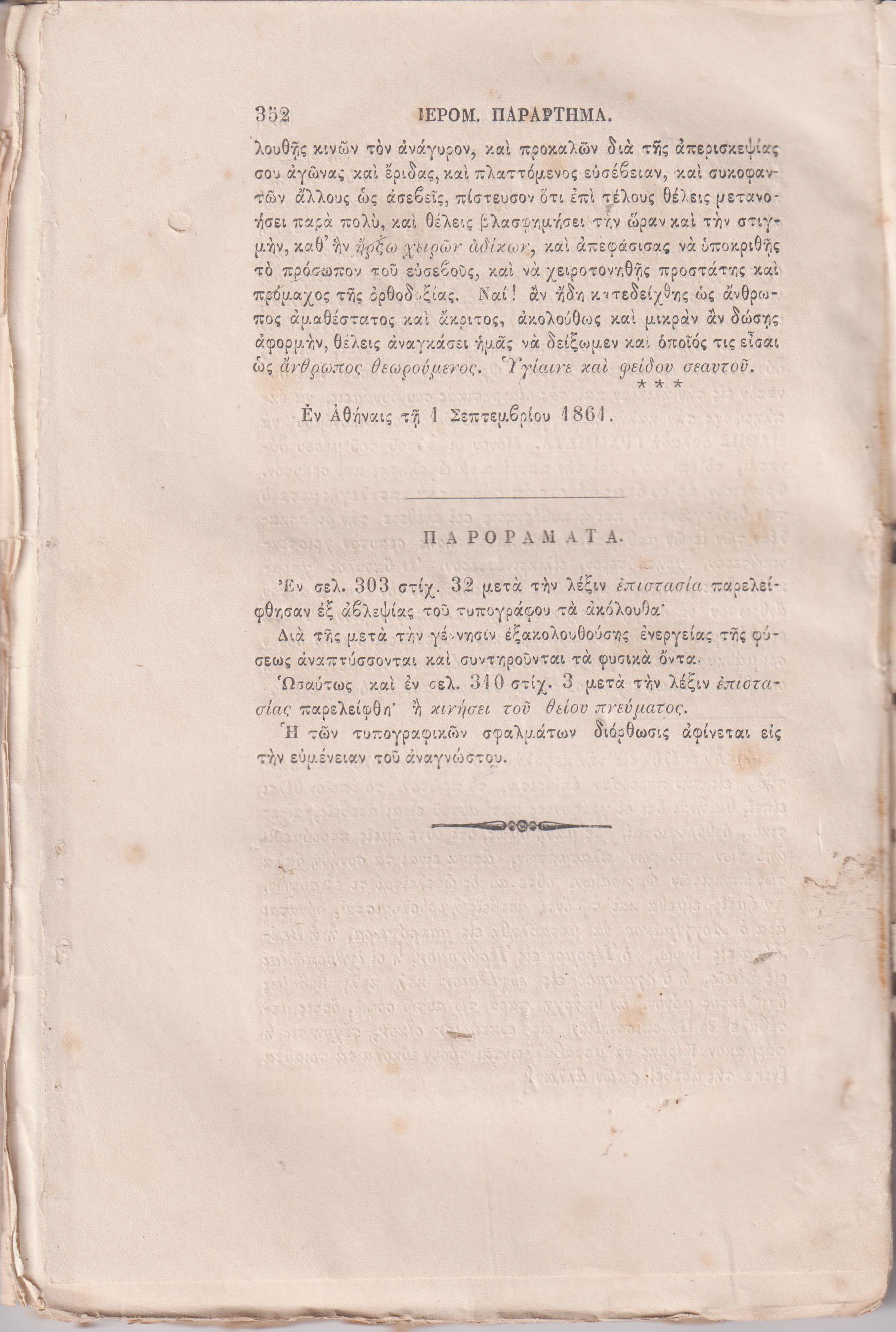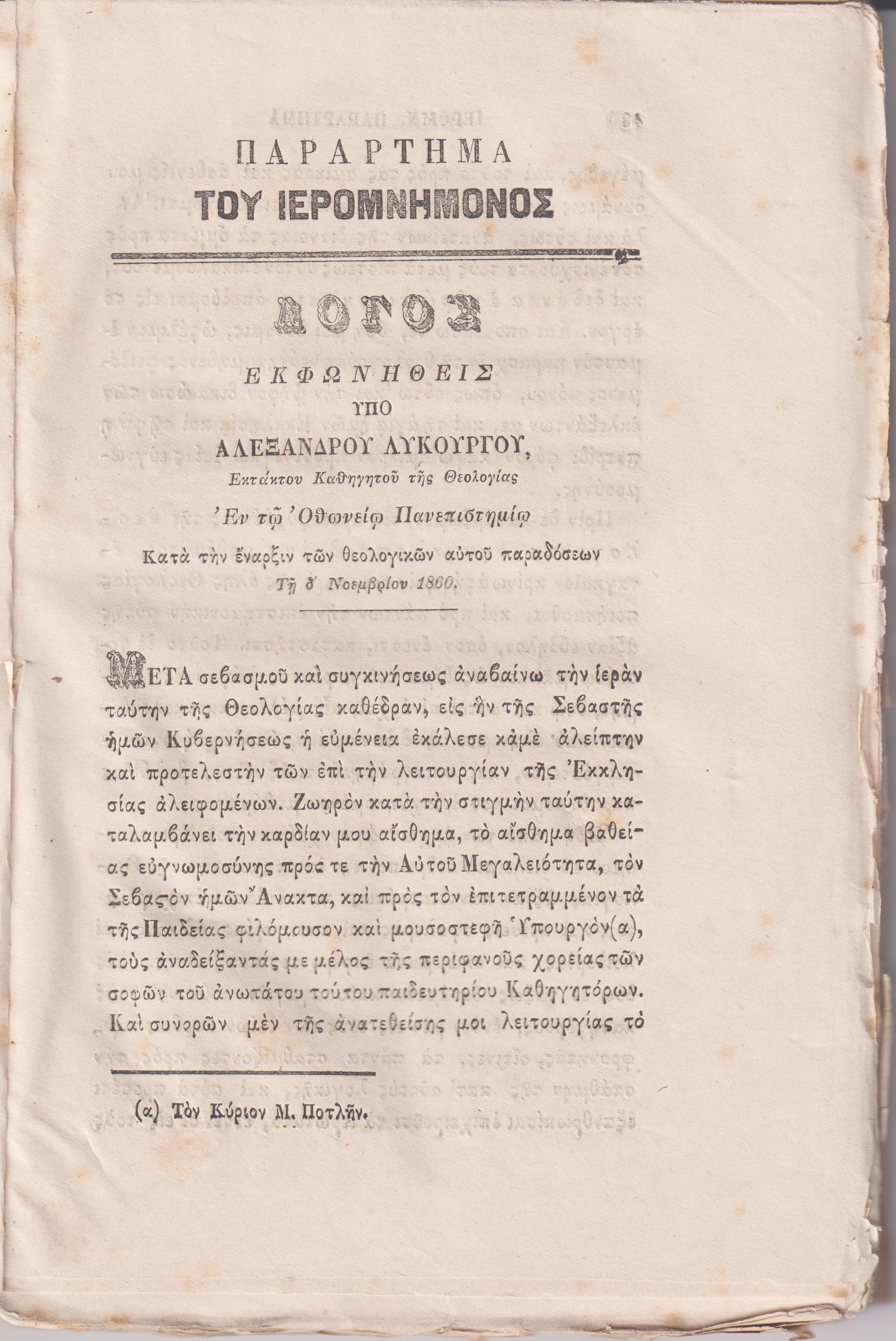 «ΙΕΡΟΜΝΗΜΩΝ» 1861, Ήτοι επιστημονικόν θεολογικόν σύγγραμμα περιέχον ύλην εκ πάντων των κλάδων της Θεολογίας, και εκδιδόμενον περιοδικώς υπό ΛΥΚΟΥΡΓΟΥ ΑΛΕΞΑΝΔΡΟΥ & ΜΟΣΧΑΤΟΥ ΑΝΤΩΝΙΟΥ. Αθήνησι 1861, περίοδος [Α;] ΄, μόνο τα τεύχη Ε΄, ΣΤ΄& Ζ΄ [σ’ ένα τόμο, άδετο], σελ. 129-352, (ο τίτλος στο εξώφυλλο, άκοπα φύλλα)
